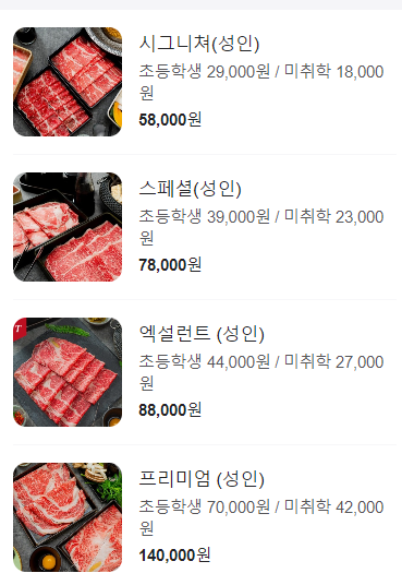 메뉴는 58,000원짜리 시그니처부터 시작해 프리미엄까지 다양하지만, 시그니처만으로도 충분한 퀄리티와 맛을 경험할 수 있습니다. 특히, 스페셜 단계로 가면 한우가 추가되는 옵션이 있는데, 이는 아직 경험해보지는 못했네요.