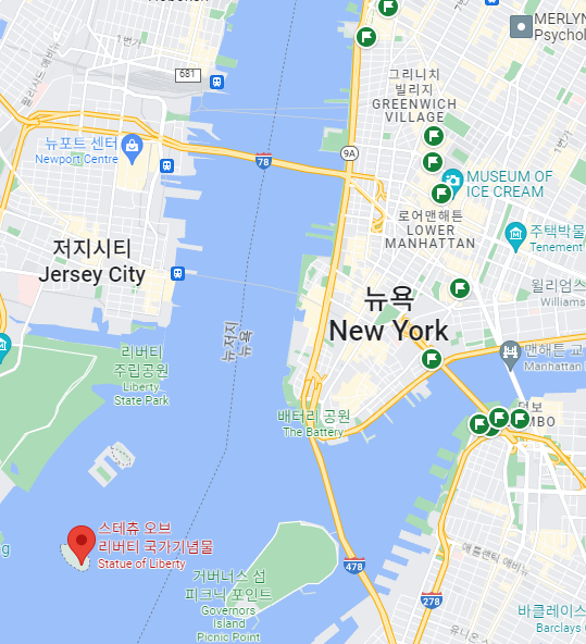 아래구글 맵에서 보는 바와 같이, 뉴욕 로어맨해튼에서 남서쪽 방향으로 있습니다.