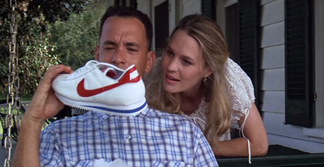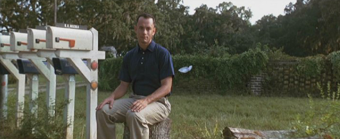 영화 첫 화면에 잔잔한 음악과 함께 검프가 의자에 앉아 날아든 흰 깃털을 가방을 열어 책갈피에 꽂아두고, 이어 버스 한대가 정차하며 한 여성이 등장해 벤치 옆에 앉아 잡지를 편다. 검프는 초콜릿 상자를 들어 여자에게 권하며 엄마가 “인생은 초콜릿 상자” 같은 거라 말했다며 그녀의 신발이 편해 보인다고 말을 건네보지만 그녀는 아무 반응을 보이지 않는다. 그리고 검프는 자신도 많은 신발을 신었다며 그 신발이 자신을 어디든 데려다 주었다며 자신의 과거를 회상하는 방식으로 화면은 전환된다.
