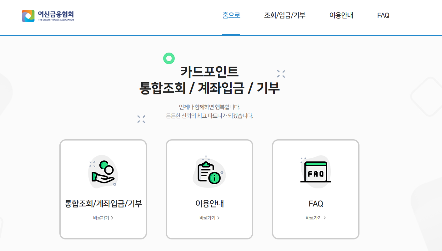 카드포인트통합조회 / 계좌입금 / 기부 언제나 함께하면 행복합니다. 든든한 신뢰의 최고 파트너가 되겠습니다.