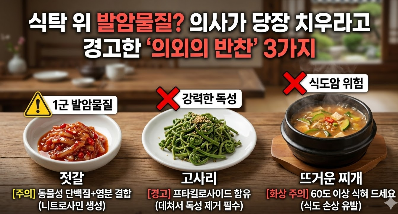 식탁에서 흔히 볼 수 있는 젓갈, 고사리, 뜨거운 찌개가 암을 유발할 수 있다는 사실, 알고 계셨나요? 응급의학과 전문의가 경고한 의외의 발암물질 음식 3가지와 독성을 안전하게 제거하고 건강하게 섭취하는 실천 방법을 정리해 드립니다.