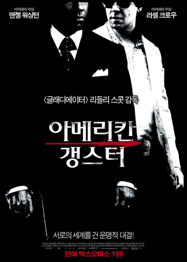 영화 *아메리칸 갱스터(American Gangster)*는 리들리 스콧(Ridley Scott) 감독이 2007년에 연출한 범죄 드라마 영화로, 실화를 바탕으로 한 탄탄한 스토리와 뛰어난 연기력으로 많은 호평을 받은 작품입니다. 영화의 주연은 덴젤 워싱턴(Denzel Washington)과 러셀 크로우(Russell Crowe)가 맡아 두 배우의 강렬한 연기 대결이 큰 주목을 받았습니다. 덴젤 워싱턴은 갱스터 프랭크 루카스(Frank Lucas) 역을, 러셀 크로우는 형사 리치 로버츠(Richie Roberts) 역을 맡아 각각의 역할을 완벽하게 소화하며 극을 이끌었습니다.