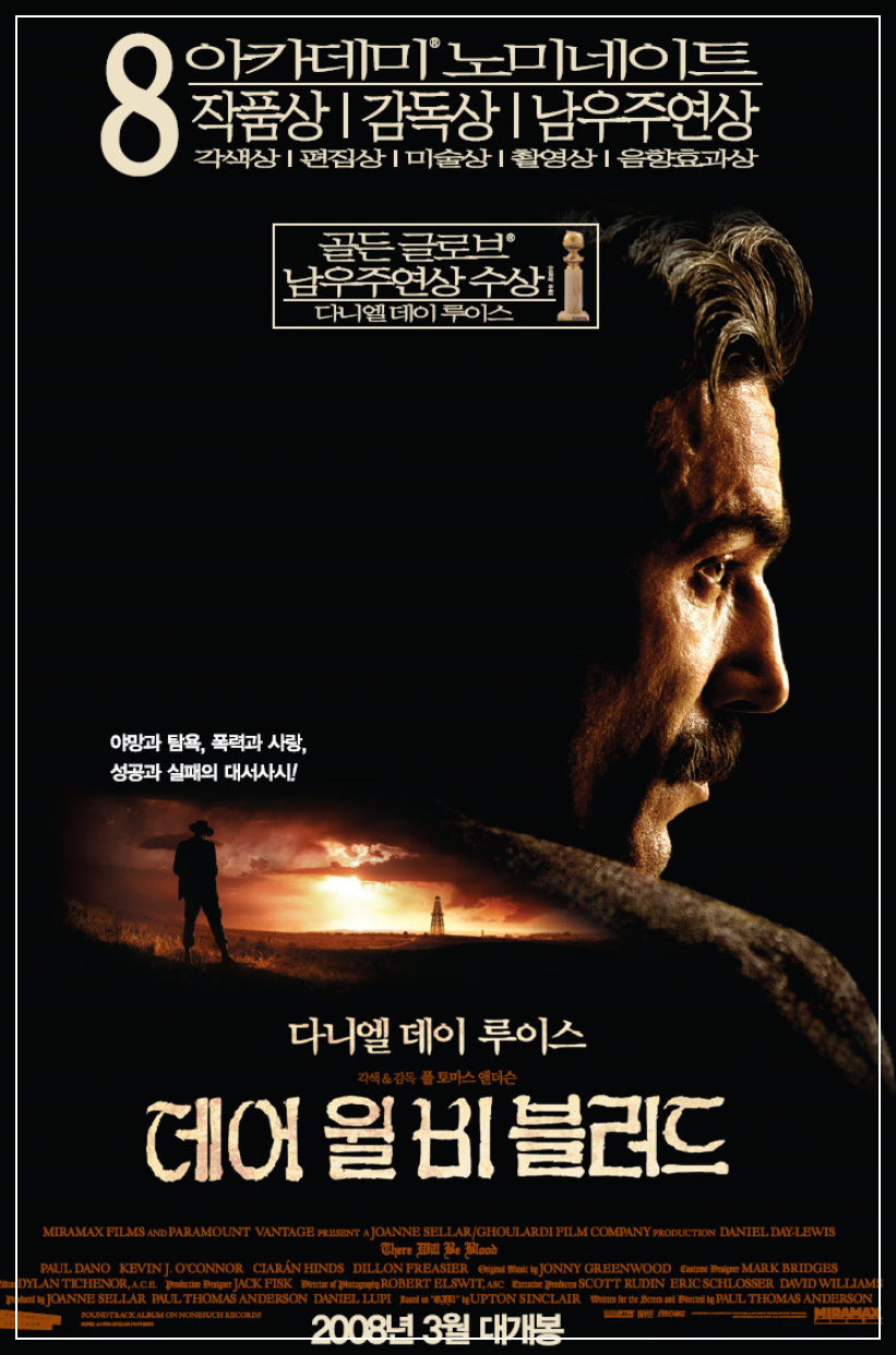 데어 윌 비 블러드는 인간의 탐욕과 고립, 물질적 성공의 어두운 이면을 극적으로 보여줍니다. 다니엘 데이 루이스는 압도적인 카리스마와 완벽한 연기력으로 다니엘 플레인뷰라는 인물을 생생하게 그려냈습니다. 그의 눈빛 하나, 목소리 톤 하나까지도 캐릭터의 깊이를 보여줍니다.