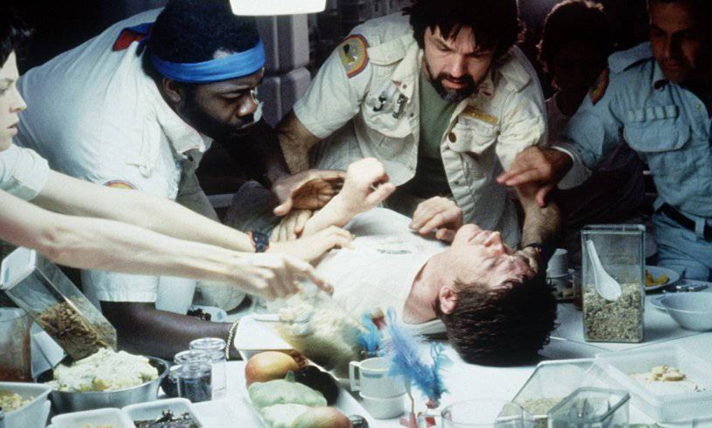영화는 화물선 노스트로모호가 지구로 돌아가던 중 의문의 SOS 신호를 받아 한 외딴 행성에 착륙하면서 시작된다. 선원들은 신호의 근원지를 탐사하던 중, 알 수 없는 생명체의 알을 발견하게 된다. 이때, 선원 중 한 명인 **케인(존 허트)**이 알에서 튀어나온 생명체에게 공격을 당하고, 그 생명체가 그의 몸 안에 기생하게 된다. 선원들은 케인을 치료하려 하지만, 그의 몸에서 에이리언이 폭력적으로 튀어나오며 본격적인 공포가 시작된다.