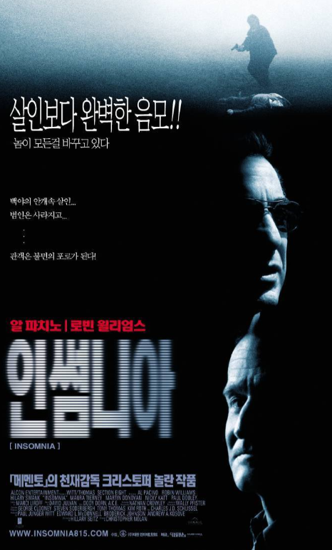 "인섬니아(Insomnia)"는 크리스토퍼 놀란(Christopher Nolan) 감독이 2002년에 연출한 심리 스릴러 영화입니다. 이 영화는 알 파치노(Al Pacino), 로빈 윌리엄스(Robin Williams), 힐러리 스웽크(Hilary Swank) 등의 스타 배우들이 주연을 맡았으며, 1997년 동명의 노르웨이 영화를 리메이크한 작품입니다.