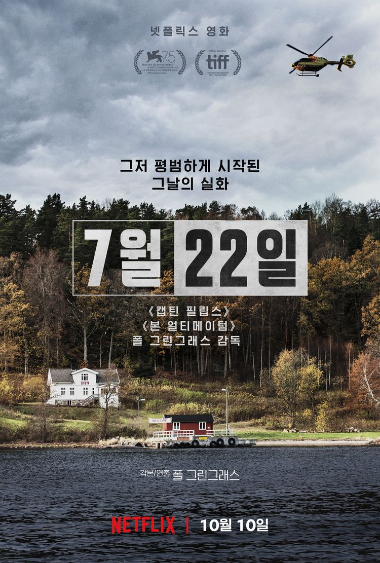 '7월 22일(2018)'이란 이 영화는 노르웨이에서 실제로 벌어진 충격적인 총격사건을 소재로 하고 있다. 노르웨이의 중추핵심인 주요 관공서를 테러한 이 사건으로, 이곳에서만 8명의 사망자와 생겨났고, 2차테러인 ‘우튀위아’ 섬에서 캠프를 즐기고 있는 학생들에 가한 총격사건 모두 포함, 77명의 사상자와 200여명의 부상자를 낸 사건이다. 너무나 참담한 실제사건을 다루고 있기 때문에, 감히 영화 장르를 스릴러라든지 첩보라든지 거론하는 것 자체가 무척 조심스럽다. 이 사건으로 인해 소중한 생명을 잃은 젊은이들에 대해 우선 고개를 숙인다.