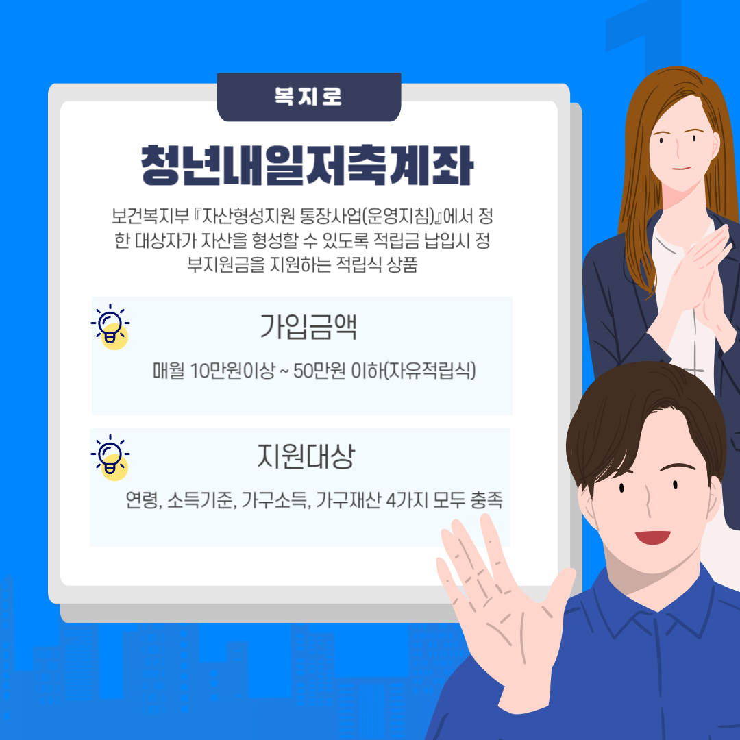 : 보건복지부 『자산형성지원 통장사업(운영지침)』에서 정한 대상자가 자산을 형성할 있도록 적립금 납입시 정부지원금을 지원하는 적립식 상품