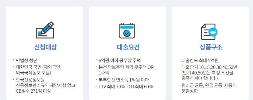 신청대상 민법상 성년 대한민국 국민 (재외국민, 외국국적동포 포함) 한국신용정보원 신용정보관리규약 해당사항 없고 CB점수 271점 이상 대출요건 6억원 이하 공부상 주택 본건 담보주택 제외