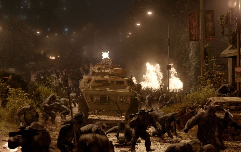 영화는 전 세계를 휩쓴 치명적인 바이러스 "시뮬라 바이러스"의 확산으로부터 10년 후의 미래를 배경으로 합니다. 인간 문명은 거의 붕괴 상태에 이르렀고, 살아남은 인간들은 고립된 생존자 그룹으로 전락한 상태입니다. 반면, 시저가 이끄는 유인원들은 샌프란시스코 근처의 숲에서 번성하며, 자신들만의 평화로운 공동체를 이루고 있습니다.